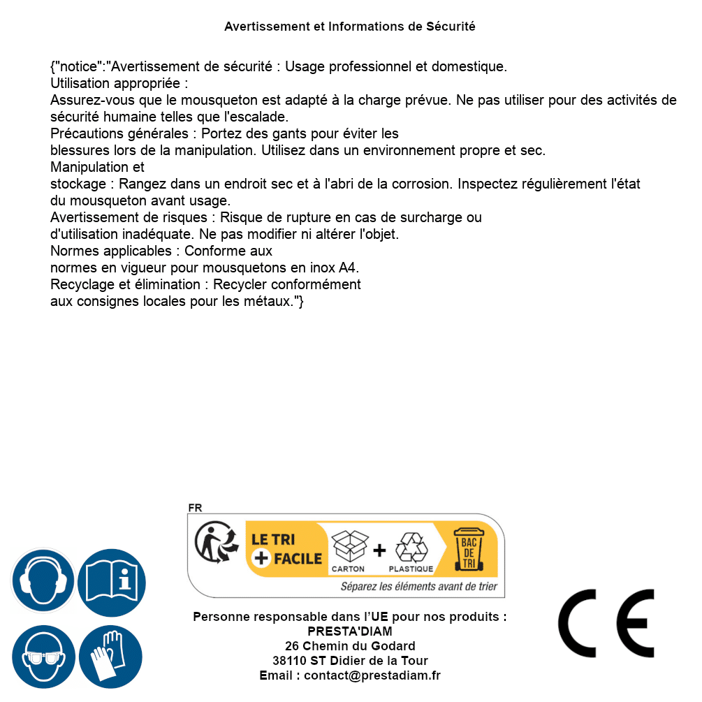 | AVERTISSEMENT et SECURITE | Identification de la personne responsable dans l’UE : Nom : PRESTA'DIAM. Adresse : 26 Chemin du Godard, 38110 ST Didier de la Tour (France). Email : contact@prestadiam.fr. |