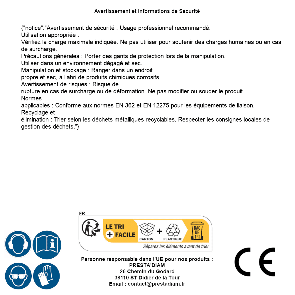 | AVERTISSEMENT et SECURITE | Identification de la personne responsable dans l’UE : Nom : PRESTA'DIAM. Adresse : 26 Chemin du Godard, 38110 ST Didier de la Tour (France). Email : contact@prestadiam.fr. |
