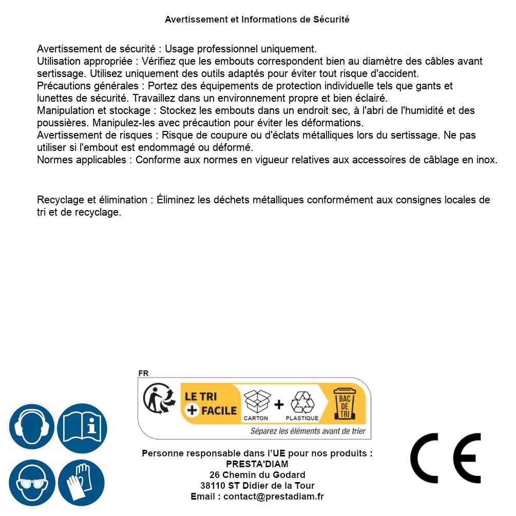 | AVERTISSEMENT et SECURITE | Identification de la personne responsable dans l’UE : Nom : PRESTA'DIAM. Adresse : 26 Chemin du Godard, 38110 ST Didier de la Tour (France). Email : contact@prestadiam.fr. |