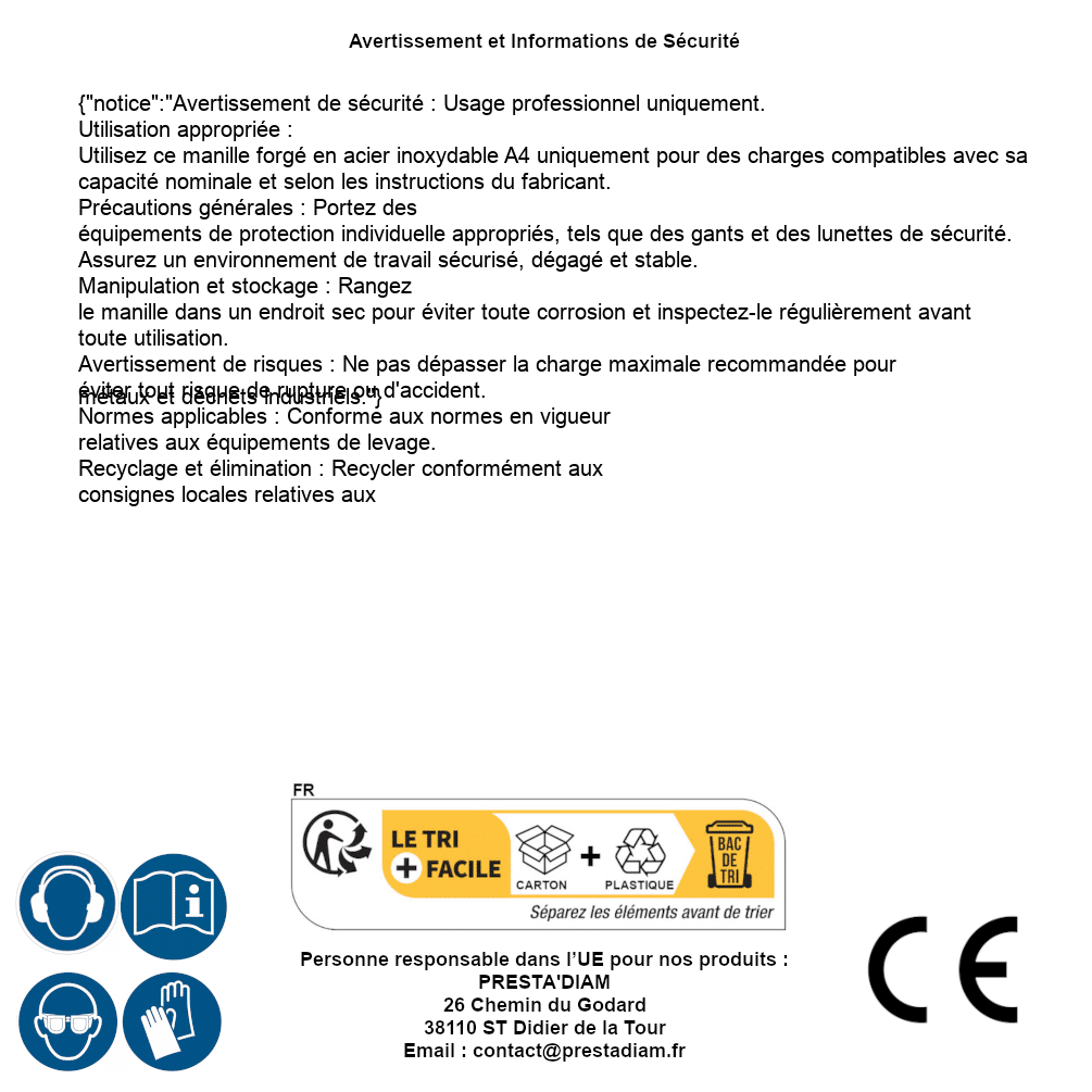 | AVERTISSEMENT et SECURITE | Identification de la personne responsable dans l’UE : Nom : PRESTA'DIAM. Adresse : 26 Chemin du Godard, 38110 ST Didier de la Tour (France). Email : contact@prestadiam.fr. |