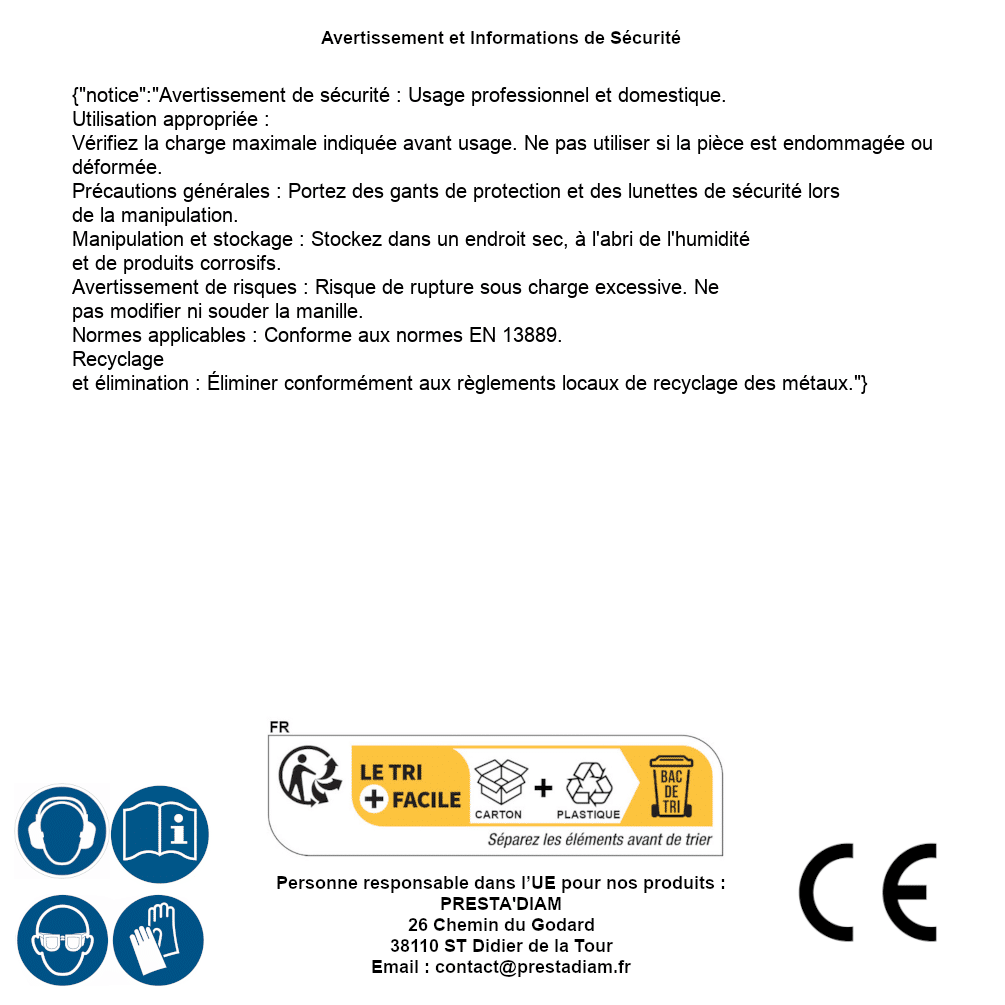 | AVERTISSEMENT et SECURITE | Identification de la personne responsable dans l’UE : Nom : PRESTA'DIAM. Adresse : 26 Chemin du Godard, 38110 ST Didier de la Tour (France). Email : contact@prestadiam.fr. |