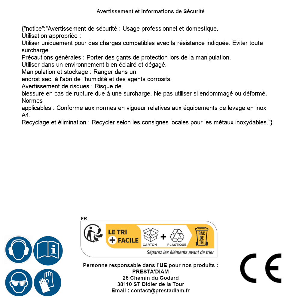 | AVERTISSEMENT et SECURITE | Identification de la personne responsable dans l’UE : Nom : PRESTA'DIAM. Adresse : 26 Chemin du Godard, 38110 ST Didier de la Tour (France). Email : contact@prestadiam.fr. |
