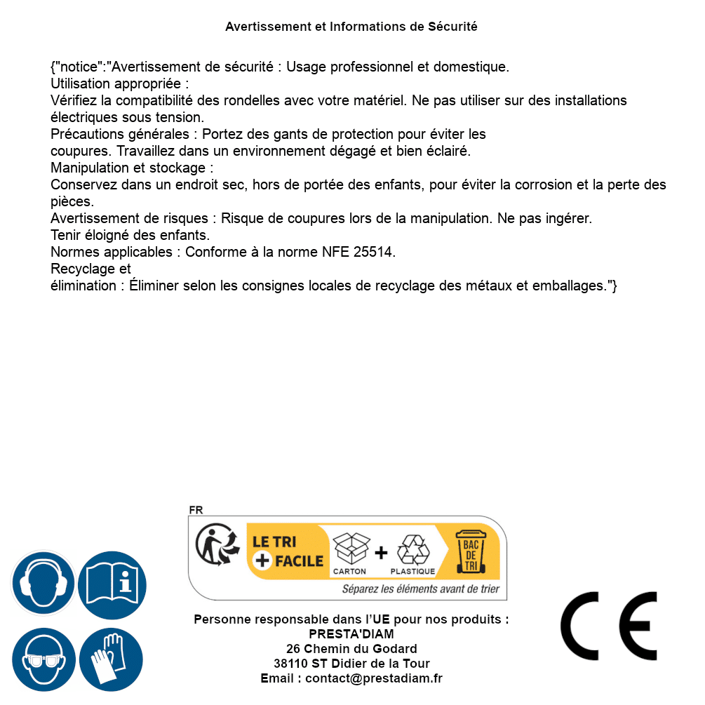 | AVERTISSEMENT et SECURITE | Identification de la personne responsable dans l’UE : Nom : PRESTA'DIAM. Adresse : 26 Chemin du Godard, 38110 ST Didier de la Tour (France). Email : contact@prestadiam.fr. |