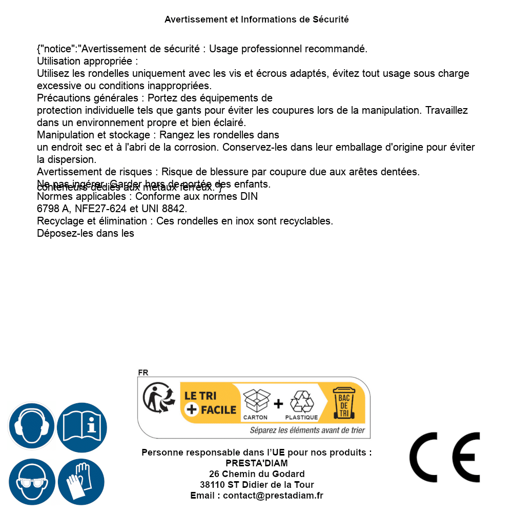 | AVERTISSEMENT et SECURITE | Identification de la personne responsable dans l’UE : Nom : PRESTA'DIAM. Adresse : 26 Chemin du Godard, 38110 ST Didier de la Tour (France). Email : contact@prestadiam.fr. |