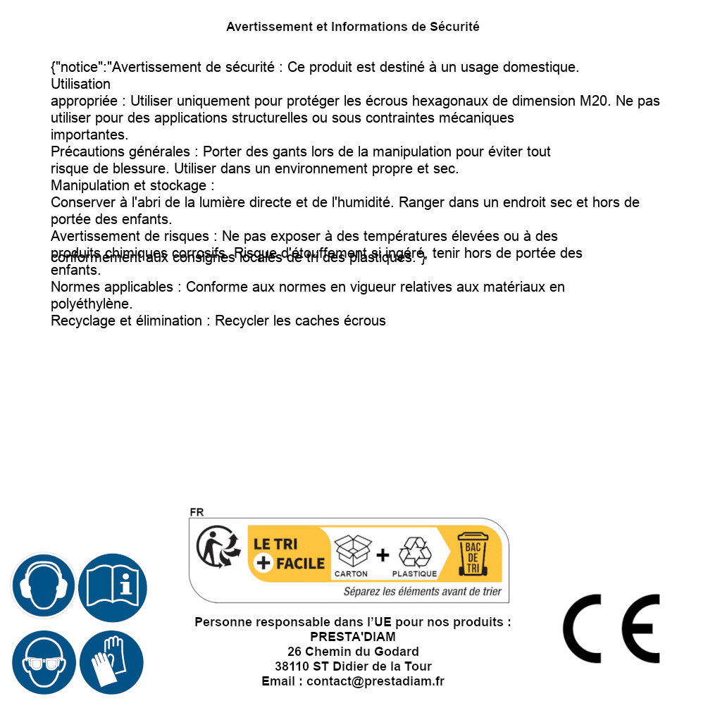 | AVERTISSEMENT et SECURITE | Identification de la personne responsable dans l’UE : Nom : PRESTA'DIAM. Adresse : 26 Chemin du Godard, 38110 ST Didier de la Tour (France). Email : contact@prestadiam.fr. |