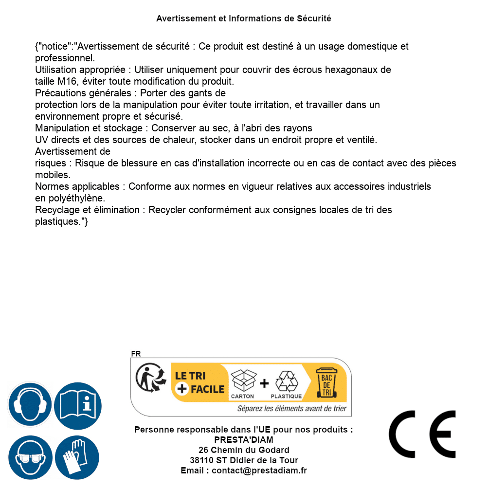 Idéal pour la protection des écrous hexagonaux M16 dans les secteurs industriels, du bâtiment et de la maintenance. Convient pour une utilisation intérieure et extérieure.