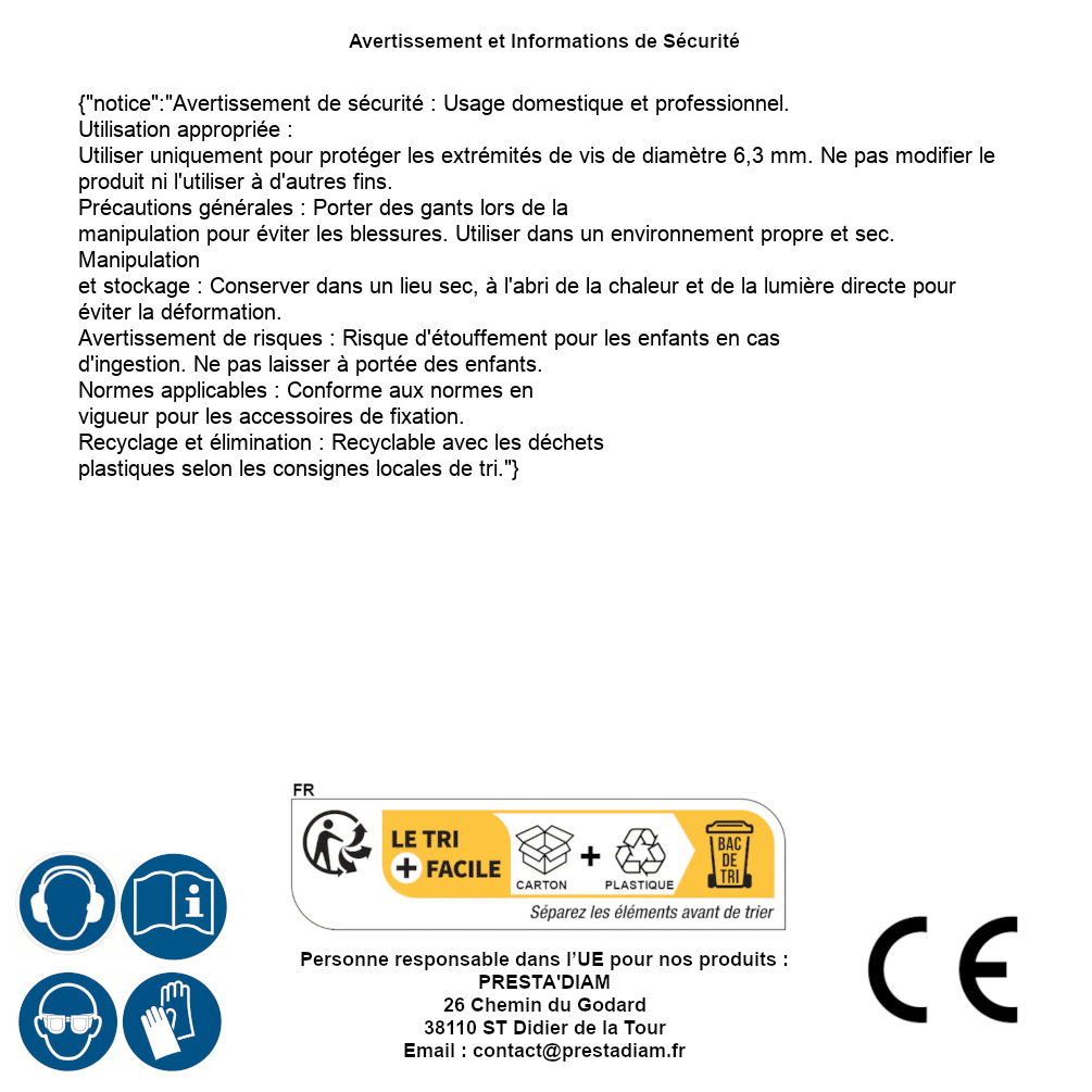 | AVERTISSEMENT et SECURITE | Identification de la personne responsable dans l’UE : Nom : PRESTA'DIAM. Adresse : 26 Chemin du Godard, 38110 ST Didier de la Tour (France). Email : contact@prestadiam.fr. |