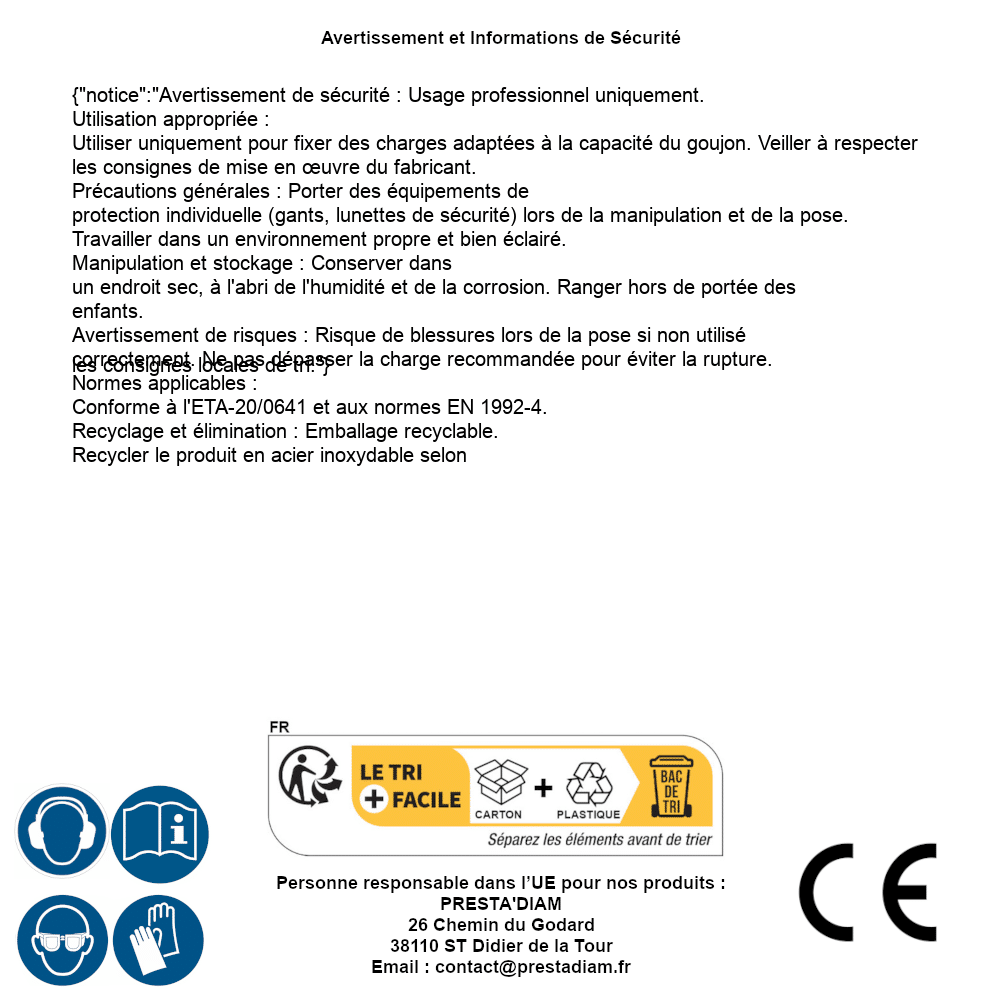 | AVERTISSEMENT et SECURITE | Identification de la personne responsable dans l’UE : Nom : PRESTA'DIAM. Adresse : 26 Chemin du Godard, 38110 ST Didier de la Tour (France). Email : contact@prestadiam.fr. |