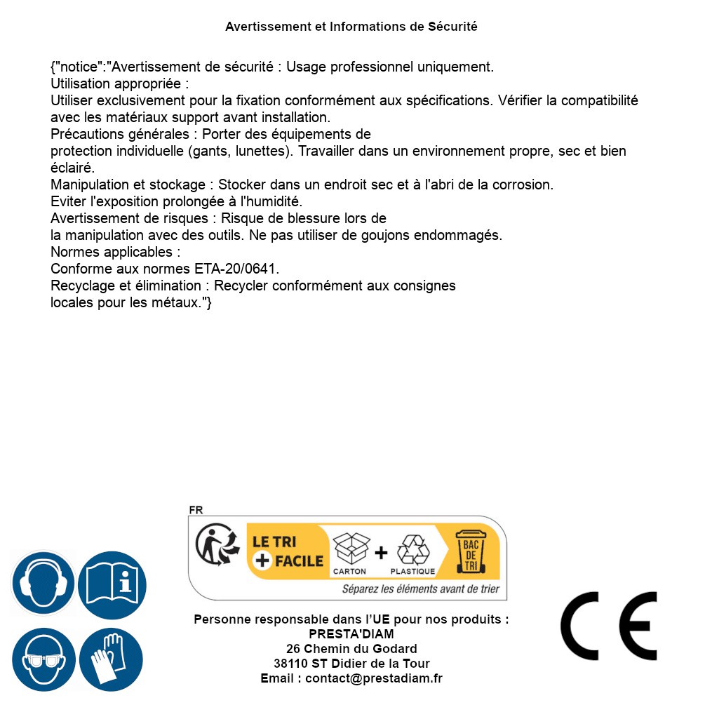 | AVERTISSEMENT et SECURITE | Identification de la personne responsable dans l’UE : Nom : PRESTA'DIAM. Adresse : 26 Chemin du Godard, 38110 ST Didier de la Tour (France). Email : contact@prestadiam.fr. |