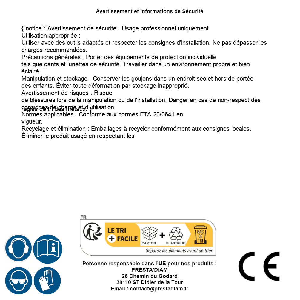 | AVERTISSEMENT et SECURITE | Identification de la personne responsable dans l’UE : Nom : PRESTA'DIAM. Adresse : 26 Chemin du Godard, 38110 ST Didier de la Tour (France). Email : contact@prestadiam.fr. |