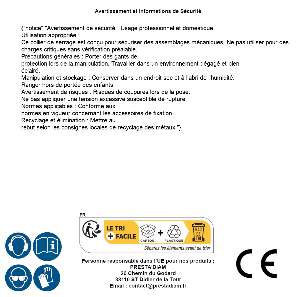 | AVERTISSEMENT et SECURITE | Identification de la personne responsable dans l’UE : Nom : PRESTA'DIAM. Adresse : 26 Chemin du Godard, 38110 ST Didier de la Tour (France). Email : contact@prestadiam.fr. |