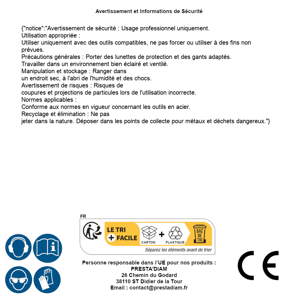 | AVERTISSEMENT et SECURITE | Identification de la personne responsable dans l’UE : Nom : PRESTA'DIAM. Adresse : 26 Chemin du Godard, 38110 ST Didier de la Tour (France). Email : contact@prestadiam.fr. |