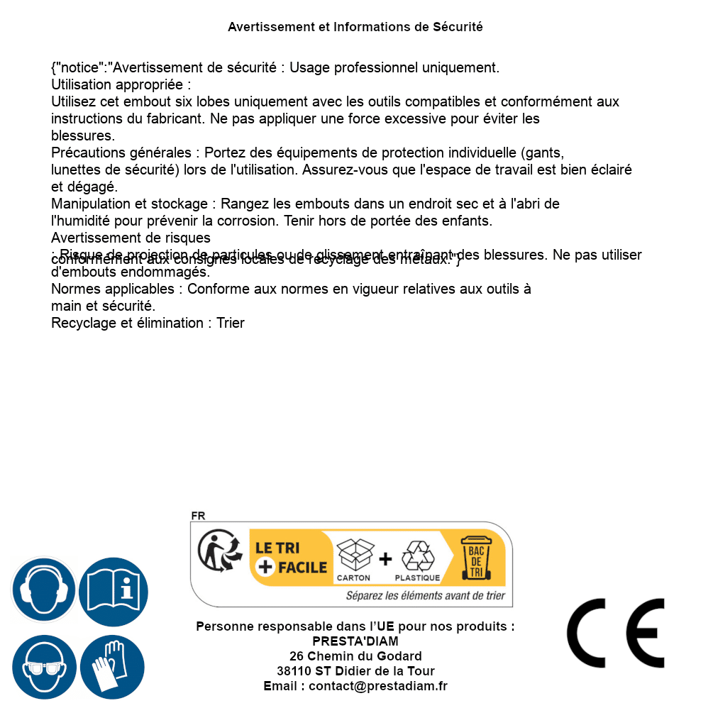 | AVERTISSEMENT et SECURITE | Identification de la personne responsable dans l’UE : Nom : PRESTA'DIAM. Adresse : 26 Chemin du Godard, 38110 ST Didier de la Tour (France). Email : contact@prestadiam.fr. |