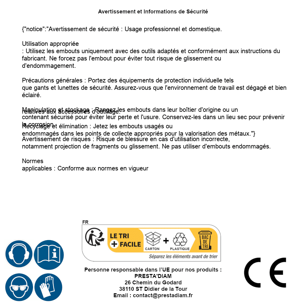 | AVERTISSEMENT et SECURITE | Identification de la personne responsable dans l’UE : Nom : PRESTA'DIAM. Adresse : 26 Chemin du Godard, 38110 ST Didier de la Tour (France). Email : contact@prestadiam.fr. |