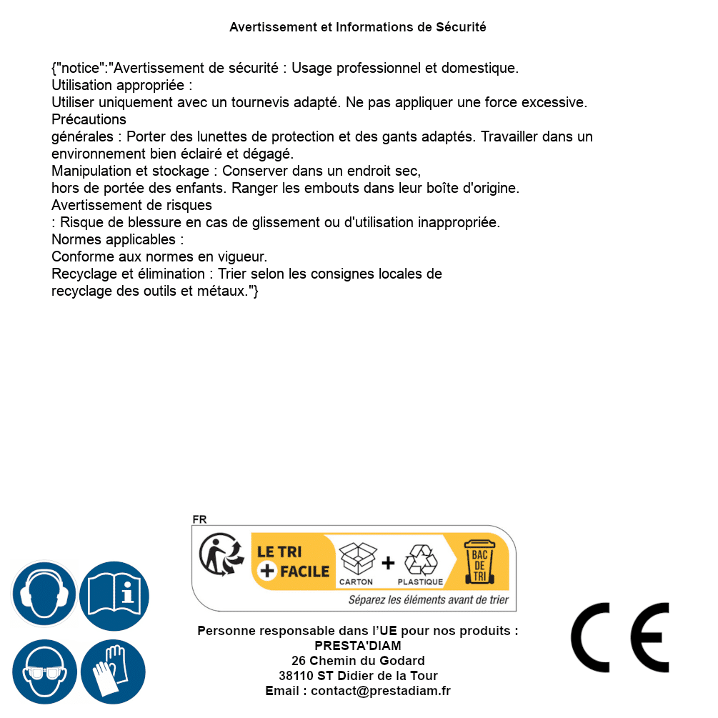 | AVERTISSEMENT et SECURITE | Identification de la personne responsable dans l’UE : Nom : PRESTA'DIAM. Adresse : 26 Chemin du Godard, 38110 ST Didier de la Tour (France). Email : contact@prestadiam.fr. |