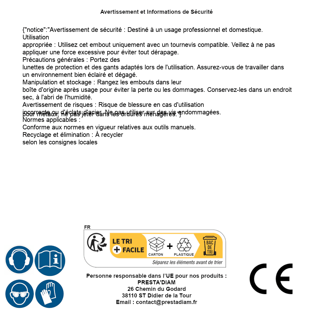 | AVERTISSEMENT et SECURITE | Identification de la personne responsable dans l’UE : Nom : PRESTA'DIAM. Adresse : 26 Chemin du Godard, 38110 ST Didier de la Tour (France). Email : contact@prestadiam.fr. |