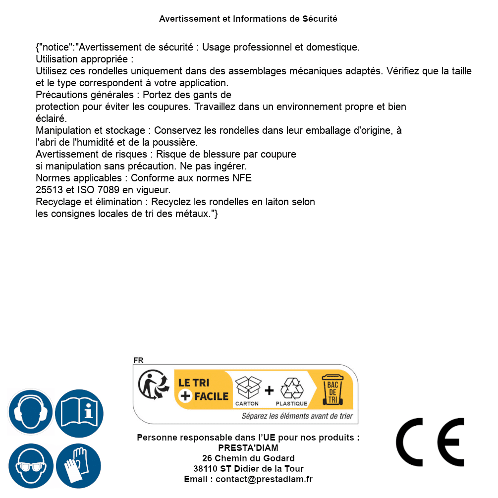 | AVERTISSEMENT et SECURITE | Identification de la personne responsable dans l’UE : Nom : PRESTA'DIAM. Adresse : 26 Chemin du Godard, 38110 ST Didier de la Tour (France). Email : contact@prestadiam.fr. |