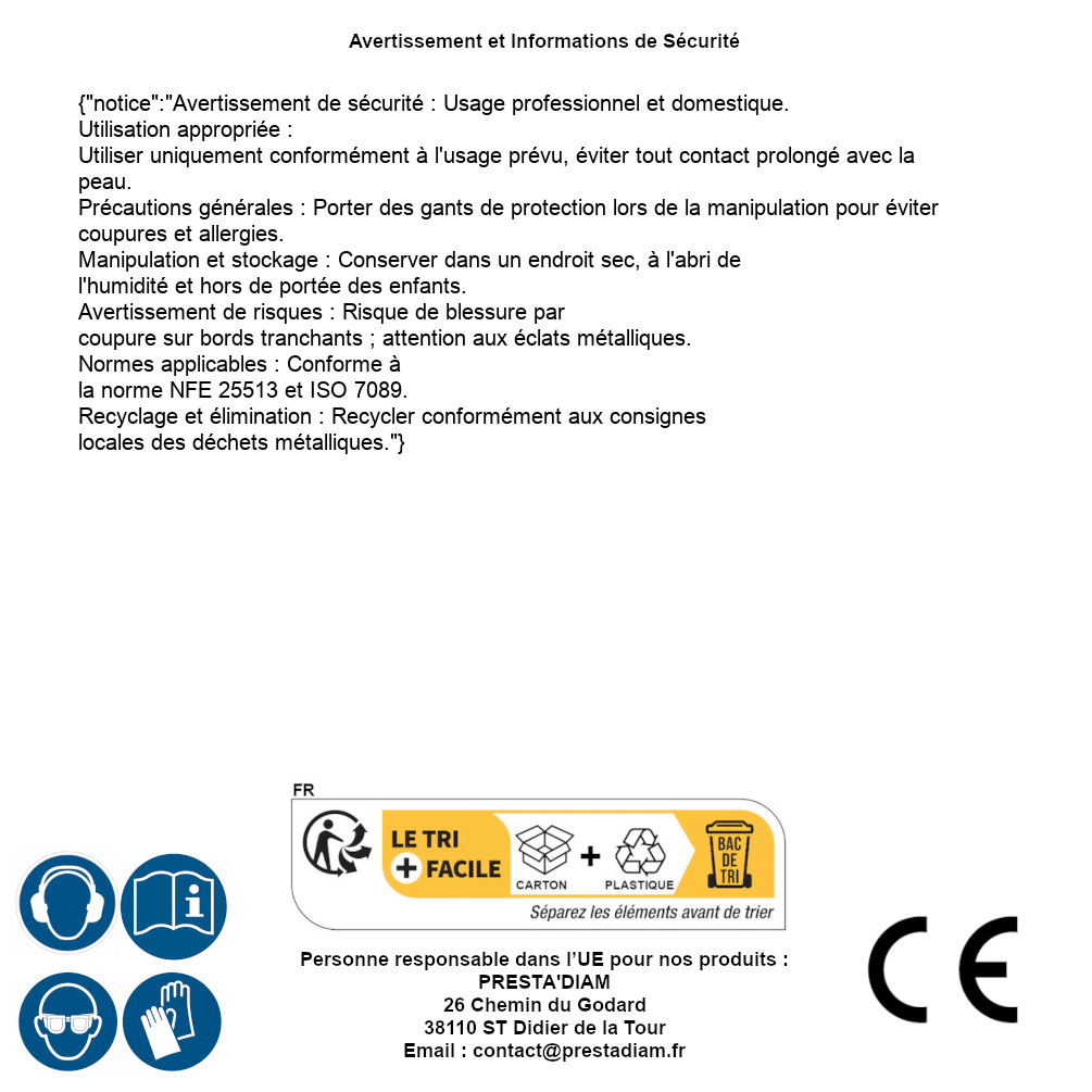 | AVERTISSEMENT et SECURITE | Identification de la personne responsable dans l’UE : Nom : PRESTA'DIAM. Adresse : 26 Chemin du Godard, 38110 ST Didier de la Tour (France). Email : contact@prestadiam.fr. |