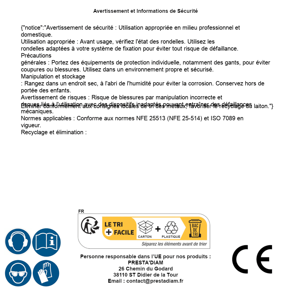 | AVERTISSEMENT et SECURITE | Identification de la personne responsable dans l’UE : Nom : PRESTA'DIAM. Adresse : 26 Chemin du Godard, 38110 ST Didier de la Tour (France). Email : contact@prestadiam.fr. |