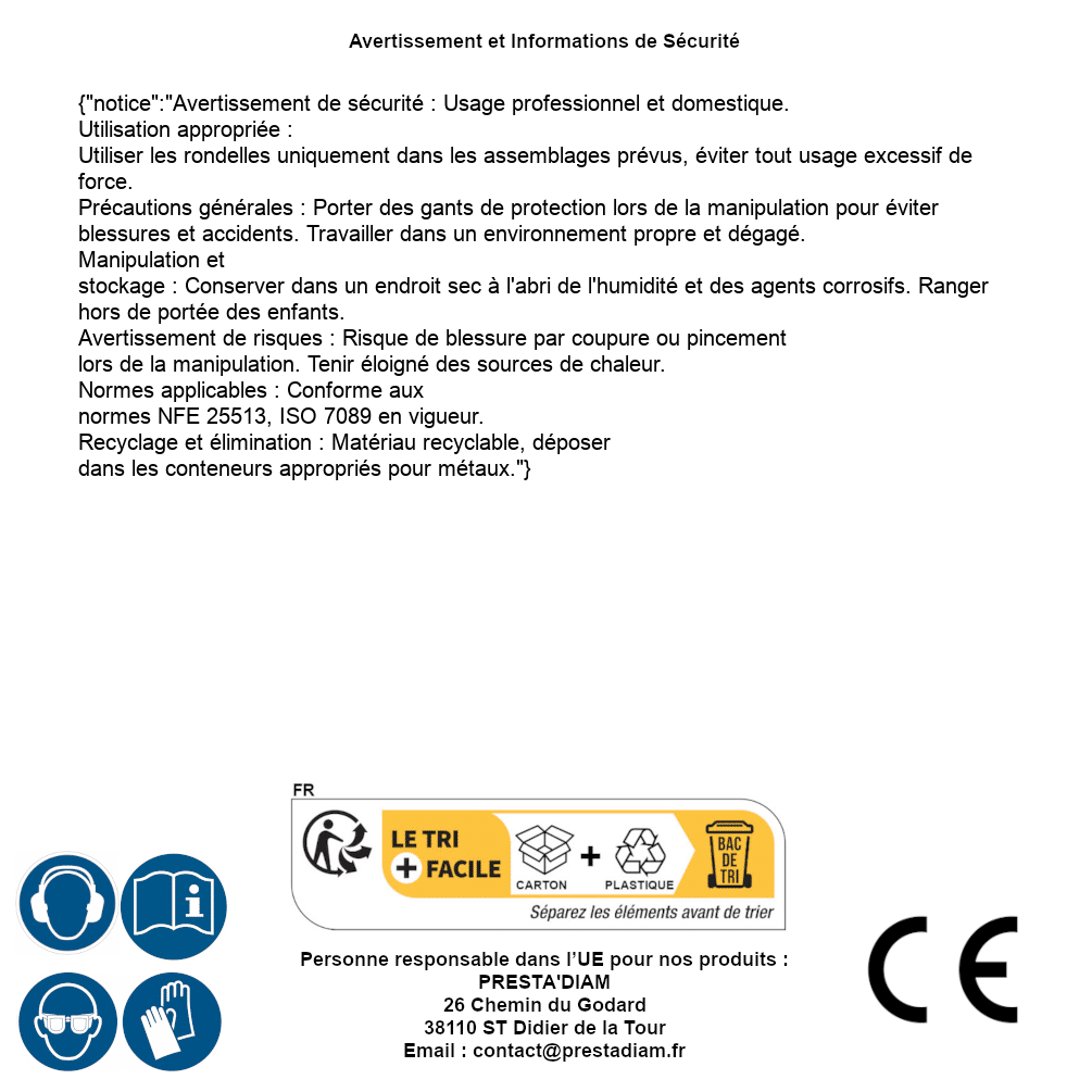 | AVERTISSEMENT et SECURITE | Identification de la personne responsable dans l’UE : Nom : PRESTA'DIAM. Adresse : 26 Chemin du Godard, 38110 ST Didier de la Tour (France). Email : contact@prestadiam.fr. |