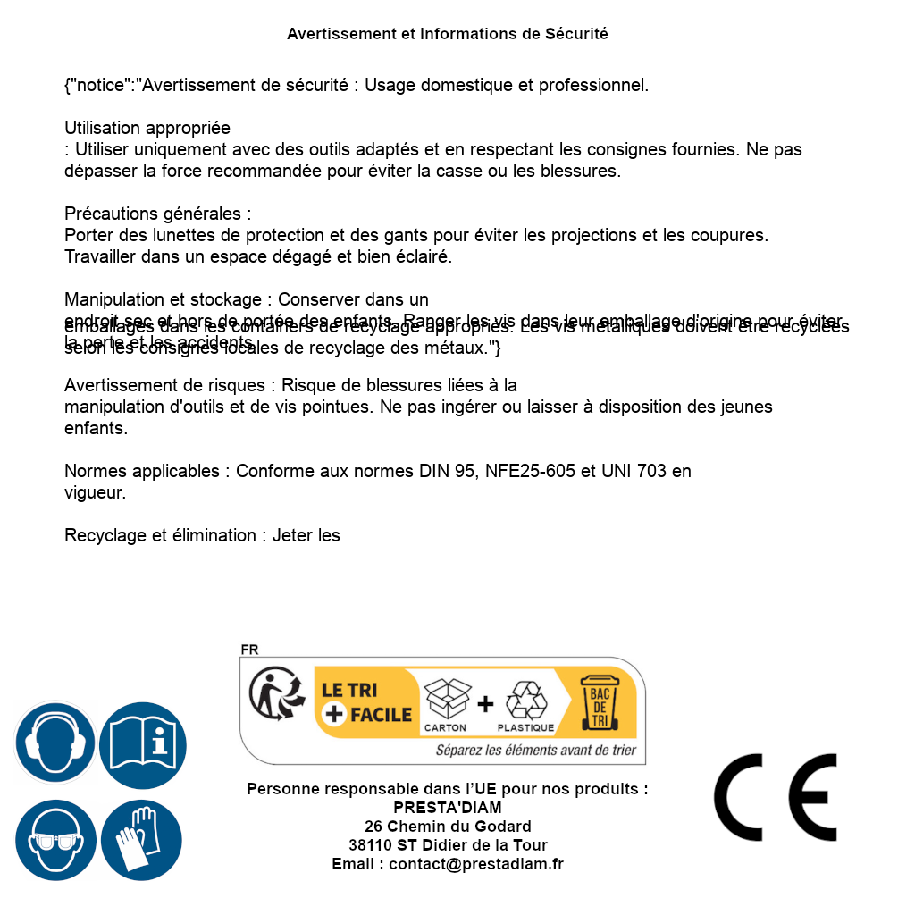 | AVERTISSEMENT et SECURITE | Identification de la personne responsable dans l’UE : Nom : PRESTA'DIAM. Adresse : 26 Chemin du Godard, 38110 ST Didier de la Tour (France). Email : contact@prestadiam.fr. |