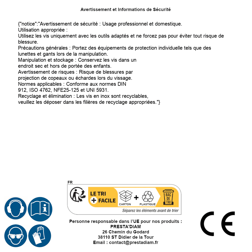 | AVERTISSEMENT et SECURITE | Identification de la personne responsable dans l’UE : Nom : PRESTA'DIAM. Adresse : 26 Chemin du Godard, 38110 ST Didier de la Tour (France). Email : contact@prestadiam.fr. |