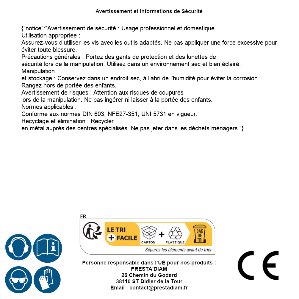 | AVERTISSEMENT et SECURITE | Identification de la personne responsable dans l’UE : Nom : PRESTA'DIAM. Adresse : 26 Chemin du Godard, 38110 ST Didier de la Tour (France). Email : contact@prestadiam.fr. |