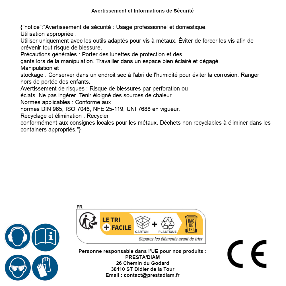 | AVERTISSEMENT et SECURITE | Identification de la personne responsable dans l’UE : Nom : PRESTA'DIAM. Adresse : 26 Chemin du Godard, 38110 ST Didier de la Tour (France). Email : contact@prestadiam.fr. |
