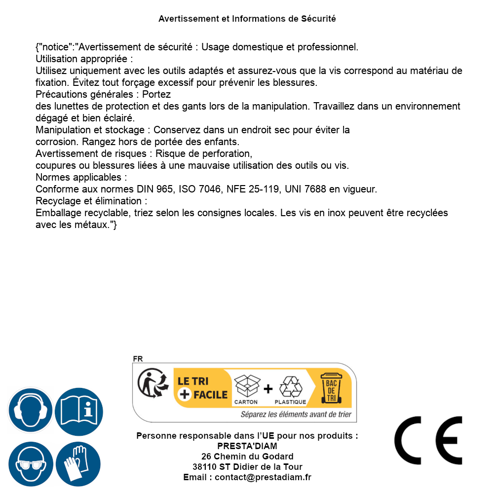 | AVERTISSEMENT et SECURITE | Identification de la personne responsable dans l’UE : Nom : PRESTA'DIAM. Adresse : 26 Chemin du Godard, 38110 ST Didier de la Tour (France). Email : contact@prestadiam.fr. |