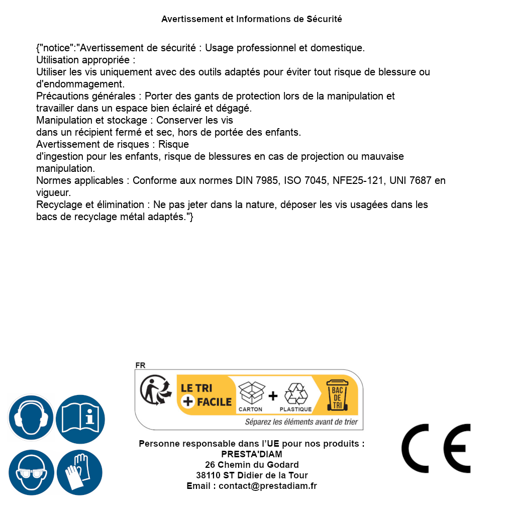 - Norme : DIN 7985 (similaire ISO 7045, NFE25-121, UNI 7687)