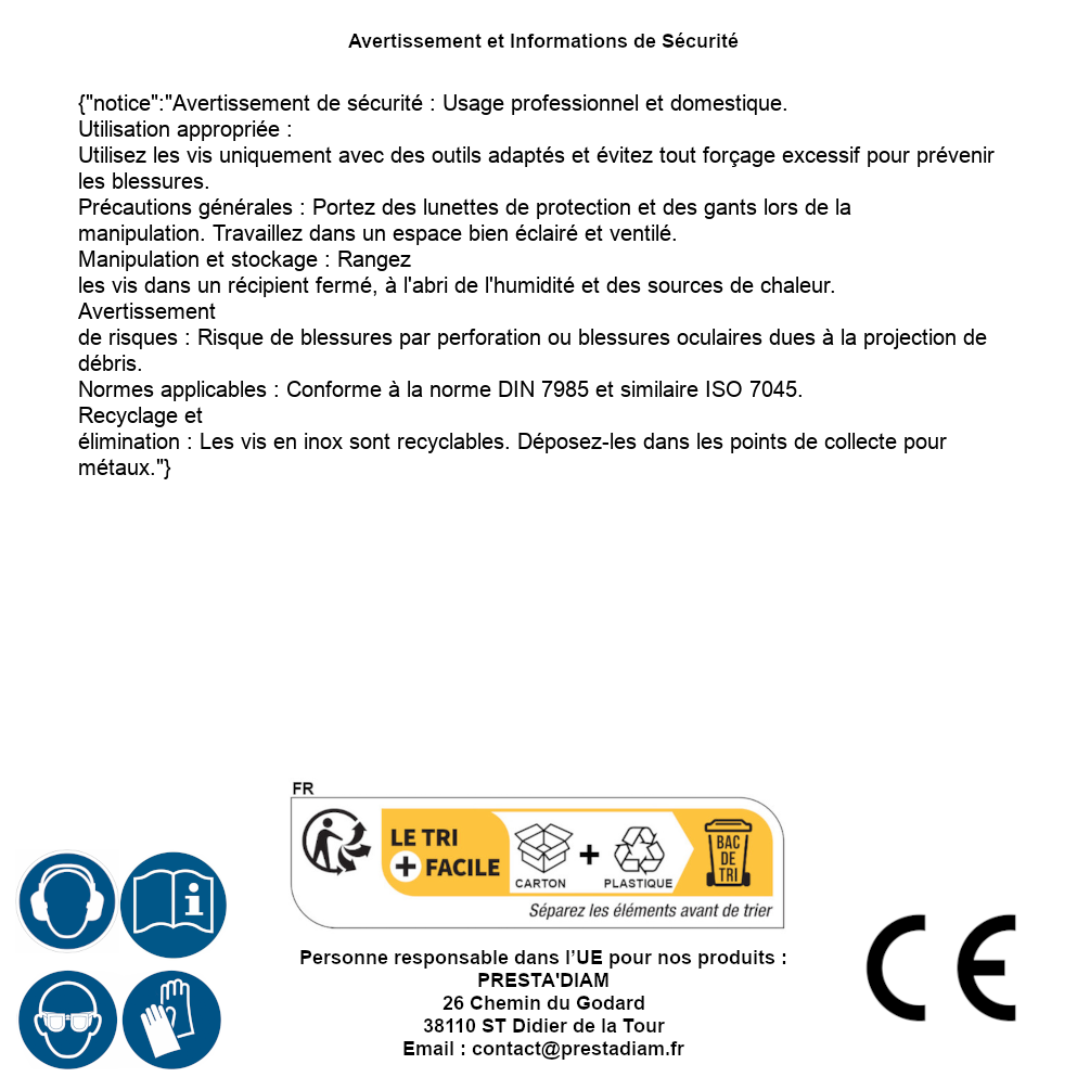 | AVERTISSEMENT et SECURITE | Identification de la personne responsable dans l’UE : Nom : PRESTA'DIAM. Adresse : 26 Chemin du Godard, 38110 ST Didier de la Tour (France). Email : contact@prestadiam.fr. |