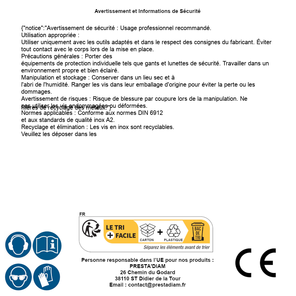 | AVERTISSEMENT et SECURITE | Identification de la personne responsable dans l’UE : Nom : PRESTA'DIAM. Adresse : 26 Chemin du Godard, 38110 ST Didier de la Tour (France). Email : contact@prestadiam.fr. |