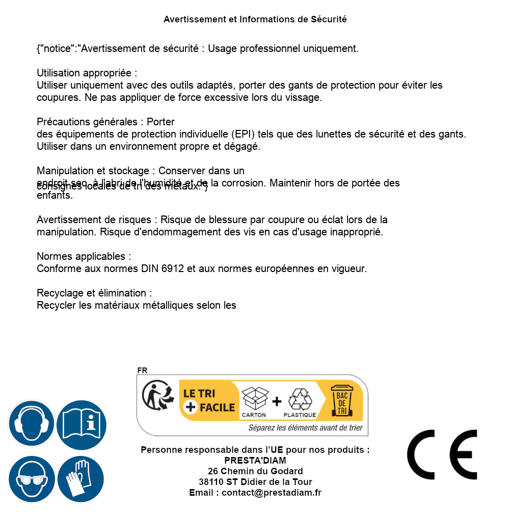 | AVERTISSEMENT et SECURITE | Identification de la personne responsable dans l’UE : Nom : PRESTA'DIAM. Adresse : 26 Chemin du Godard, 38110 ST Didier de la Tour (France). Email : contact@prestadiam.fr. |