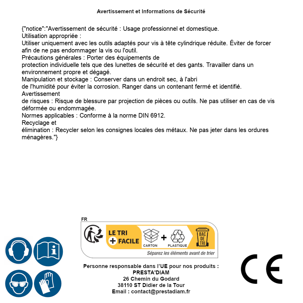 | AVERTISSEMENT et SECURITE | Identification de la personne responsable dans l’UE : Nom : PRESTA'DIAM. Adresse : 26 Chemin du Godard, 38110 ST Didier de la Tour (France). Email : contact@prestadiam.fr. |