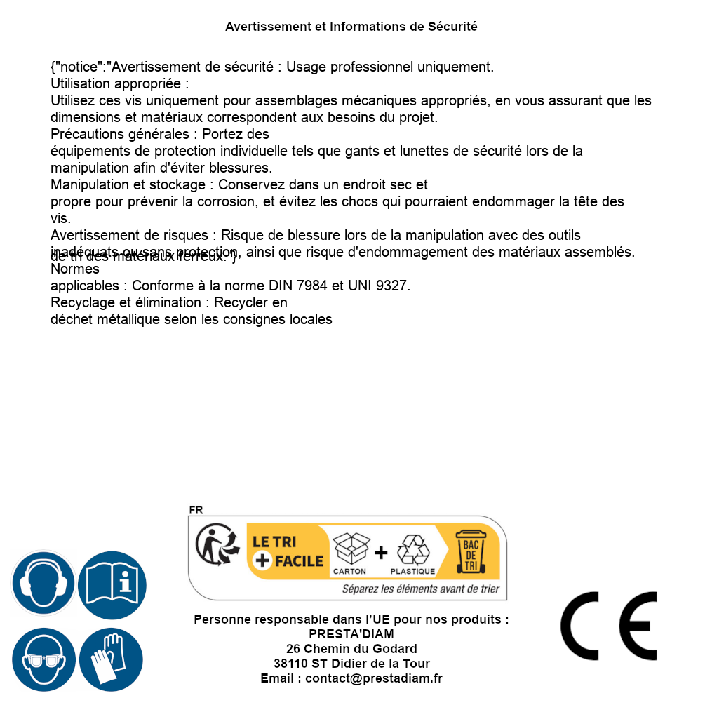 | AVERTISSEMENT et SECURITE | Identification de la personne responsable dans l’UE : Nom : PRESTA'DIAM. Adresse : 26 Chemin du Godard, 38110 ST Didier de la Tour (France). Email : contact@prestadiam.fr. |