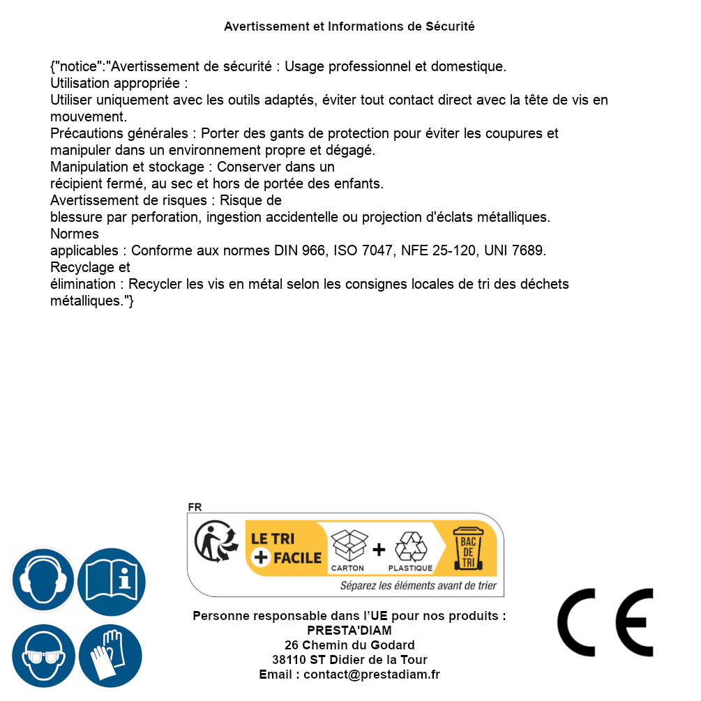 | AVERTISSEMENT et SECURITE | Identification de la personne responsable dans l’UE : Nom : PRESTA'DIAM. Adresse : 26 Chemin du Godard, 38110 ST Didier de la Tour (France). Email : contact@prestadiam.fr. |