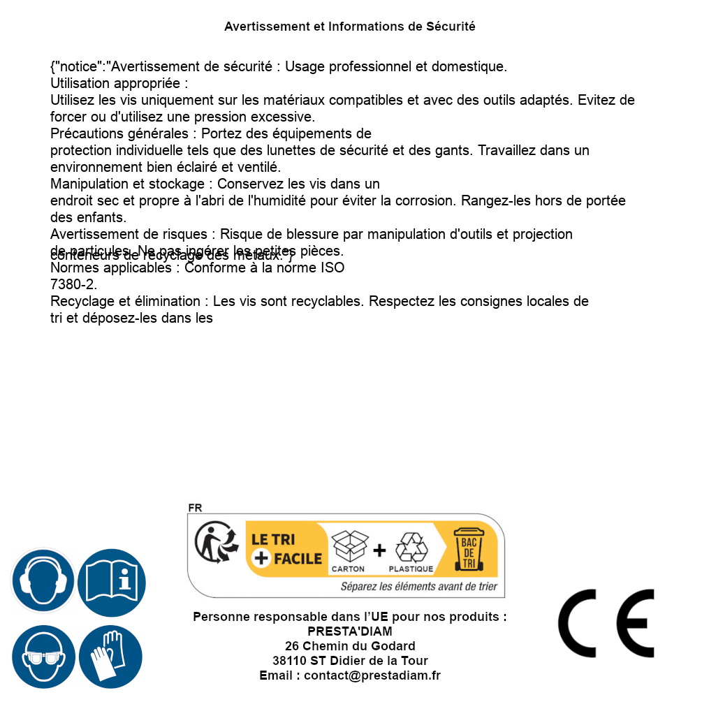 | AVERTISSEMENT et SECURITE | Identification de la personne responsable dans l’UE : Nom : PRESTA'DIAM. Adresse : 26 Chemin du Godard, 38110 ST Didier de la Tour (France). Email : contact@prestadiam.fr. |