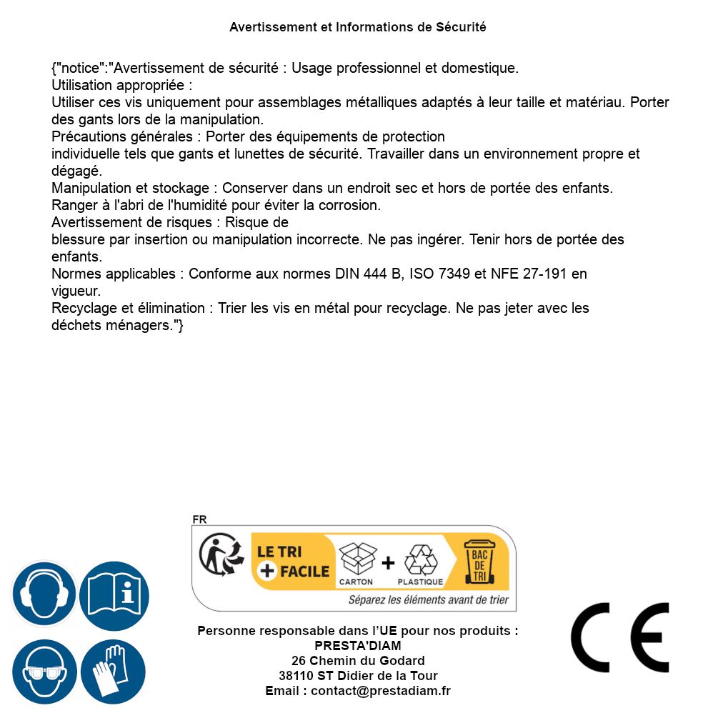 | AVERTISSEMENT et SECURITE | Identification de la personne responsable dans l’UE : Nom : PRESTA'DIAM. Adresse : 26 Chemin du Godard, 38110 ST Didier de la Tour (France). Email : contact@prestadiam.fr. |