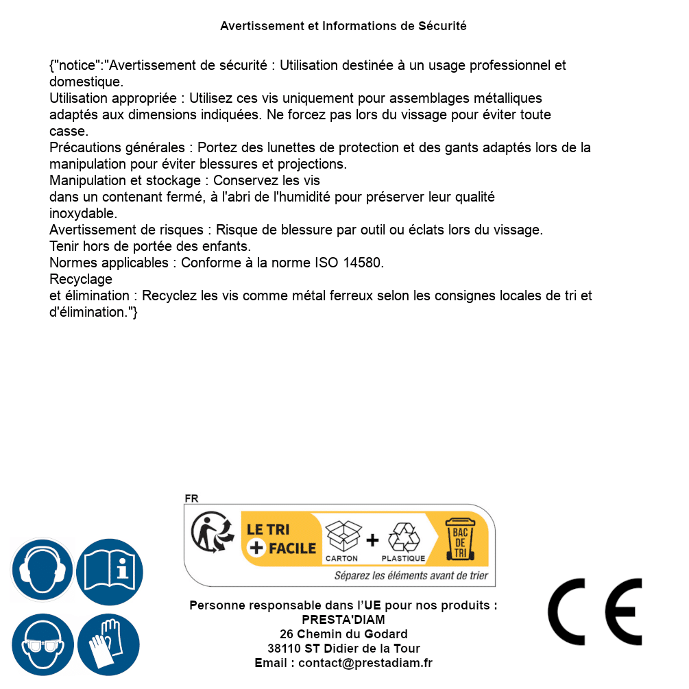 | AVERTISSEMENT et SECURITE | Identification de la personne responsable dans l’UE : Nom : PRESTA'DIAM. Adresse : 26 Chemin du Godard, 38110 ST Didier de la Tour (France). Email : contact@prestadiam.fr. |