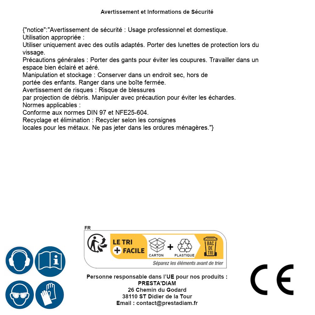 | AVERTISSEMENT et SECURITE | Identification de la personne responsable dans l’UE : Nom : PRESTA'DIAM. Adresse : 26 Chemin du Godard, 38110 ST Didier de la Tour (France). Email : contact@prestadiam.fr. |
