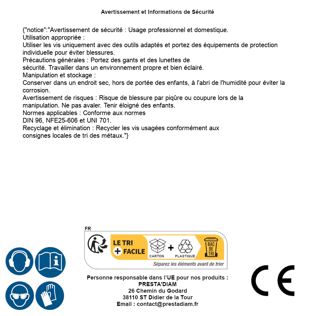 | AVERTISSEMENT et SECURITE | Identification de la personne responsable dans l’UE : Nom : PRESTA'DIAM. Adresse : 26 Chemin du Godard, 38110 ST Didier de la Tour (France). Email : contact@prestadiam.fr. |