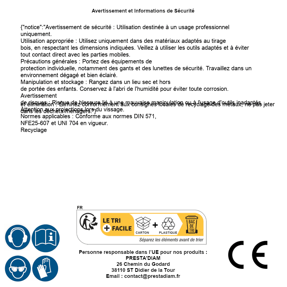 | AVERTISSEMENT et SECURITE | Identification de la personne responsable dans l’UE : Nom : PRESTA'DIAM. Adresse : 26 Chemin du Godard, 38110 ST Didier de la Tour (France). Email : contact@prestadiam.fr. |