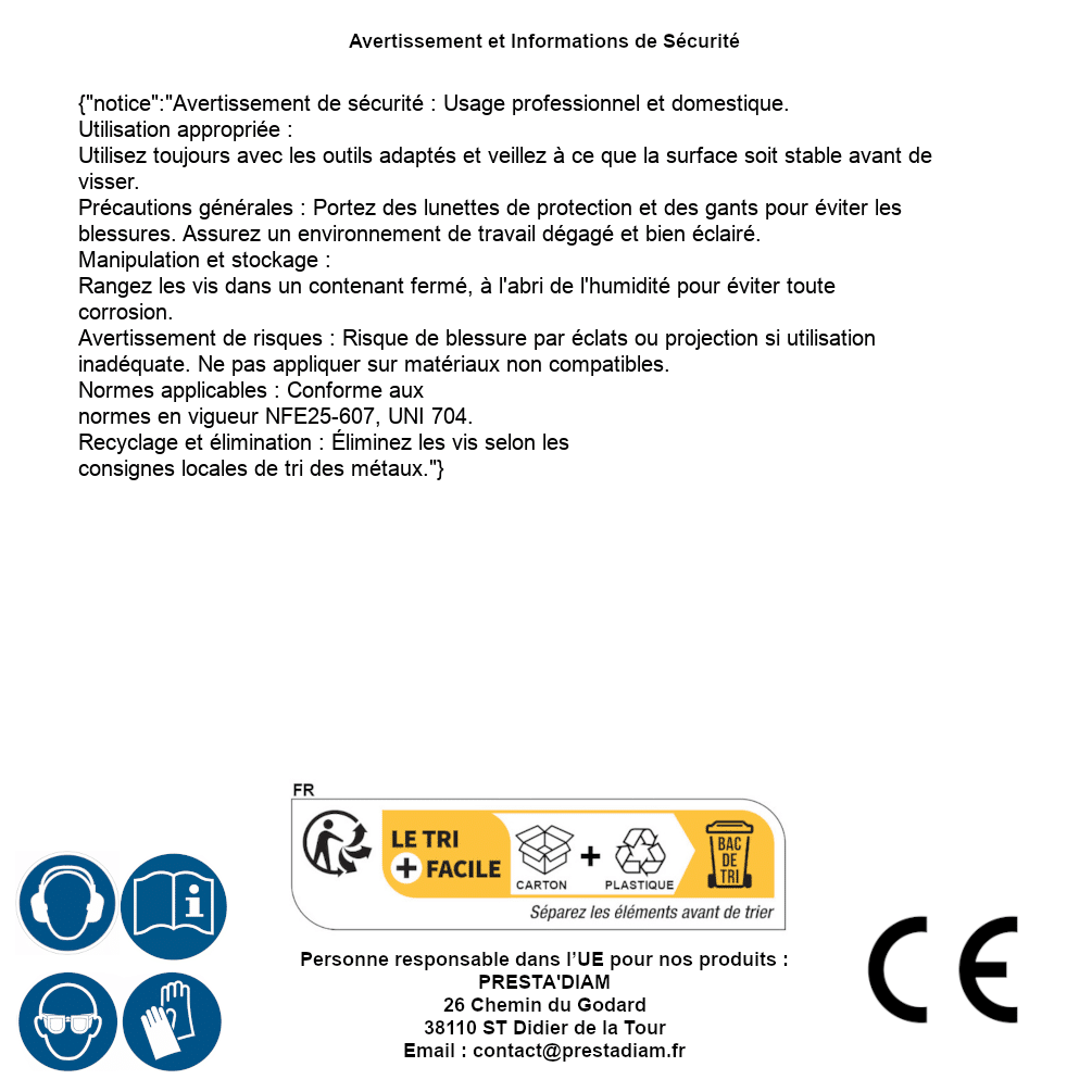 | AVERTISSEMENT et SECURITE | Identification de la personne responsable dans l’UE : Nom : PRESTA'DIAM. Adresse : 26 Chemin du Godard, 38110 ST Didier de la Tour (France). Email : contact@prestadiam.fr. |
