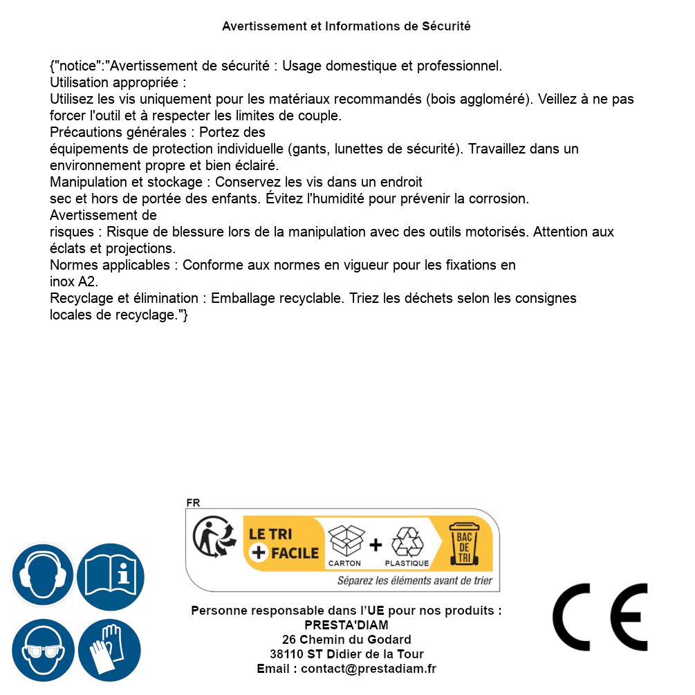 | AVERTISSEMENT et SECURITE | Identification de la personne responsable dans l’UE : Nom : PRESTA'DIAM. Adresse : 26 Chemin du Godard, 38110 ST Didier de la Tour (France). Email : contact@prestadiam.fr. |