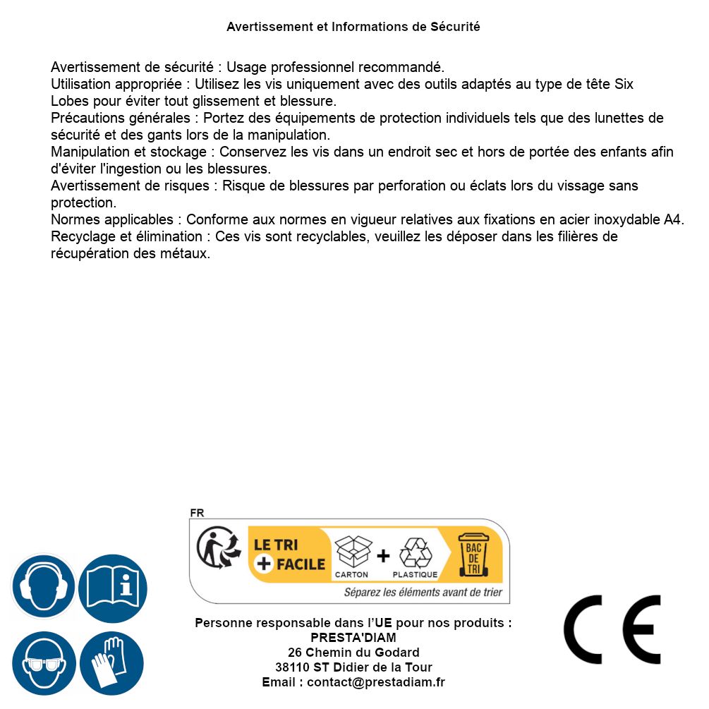 | AVERTISSEMENT et SECURITE | Identification de la personne responsable dans l’UE : Nom : PRESTA'DIAM. Adresse : 26 Chemin du Godard, 38110 ST Didier de la Tour (France). Email : contact@prestadiam.fr. |