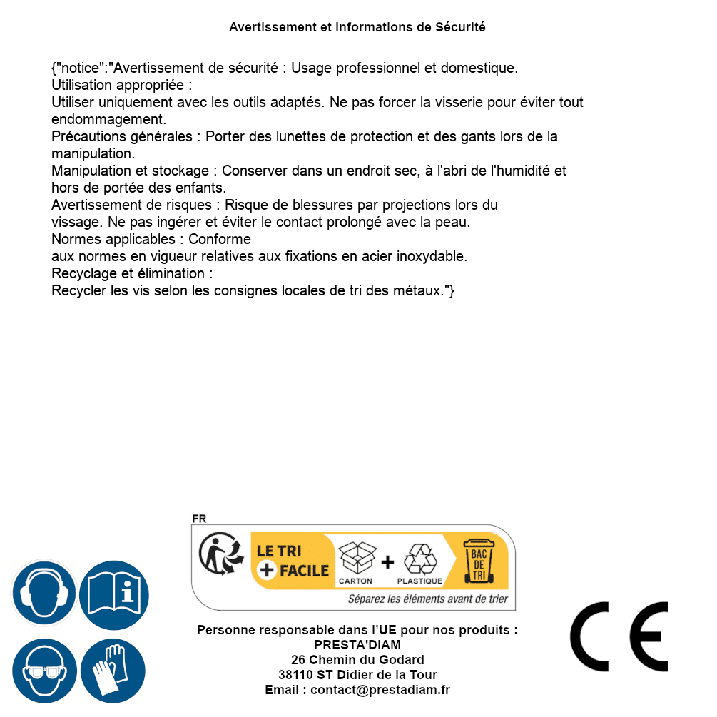 | AVERTISSEMENT et SECURITE | Identification de la personne responsable dans l’UE : Nom : PRESTA'DIAM. Adresse : 26 Chemin du Godard, 38110 ST Didier de la Tour (France). Email : contact@prestadiam.fr. |