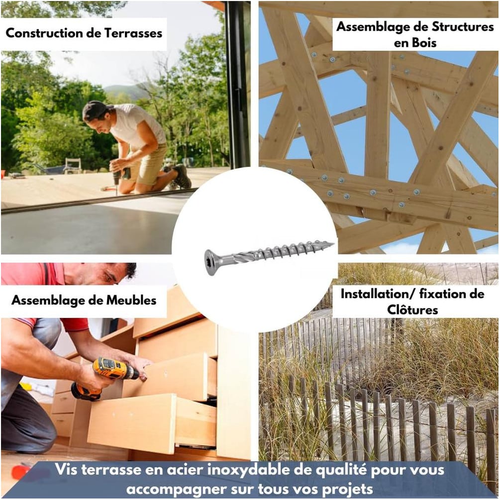 Ces vis sont recommandées pour la fixation des lames de terrasse en bois, notamment en extérieur. Utiliser une perceuse ou un tournevis adapté à l’empreinte six lobes pour un vissage optimal. Veiller à pré-percer les bois durs pour éviter les fissures. Convient pour les terrasses, bardages et autres applications extérieures nécessitant une fixation durable.