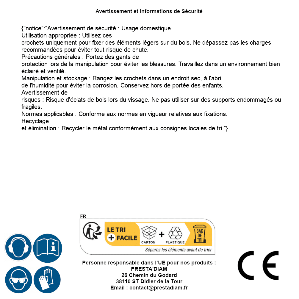 | AVERTISSEMENT et SECURITE | Identification de la personne responsable dans l’UE : Nom : PRESTA'DIAM. Adresse : 26 Chemin du Godard, 38110 ST Didier de la Tour (France). Email : contact@prestadiam.fr. |