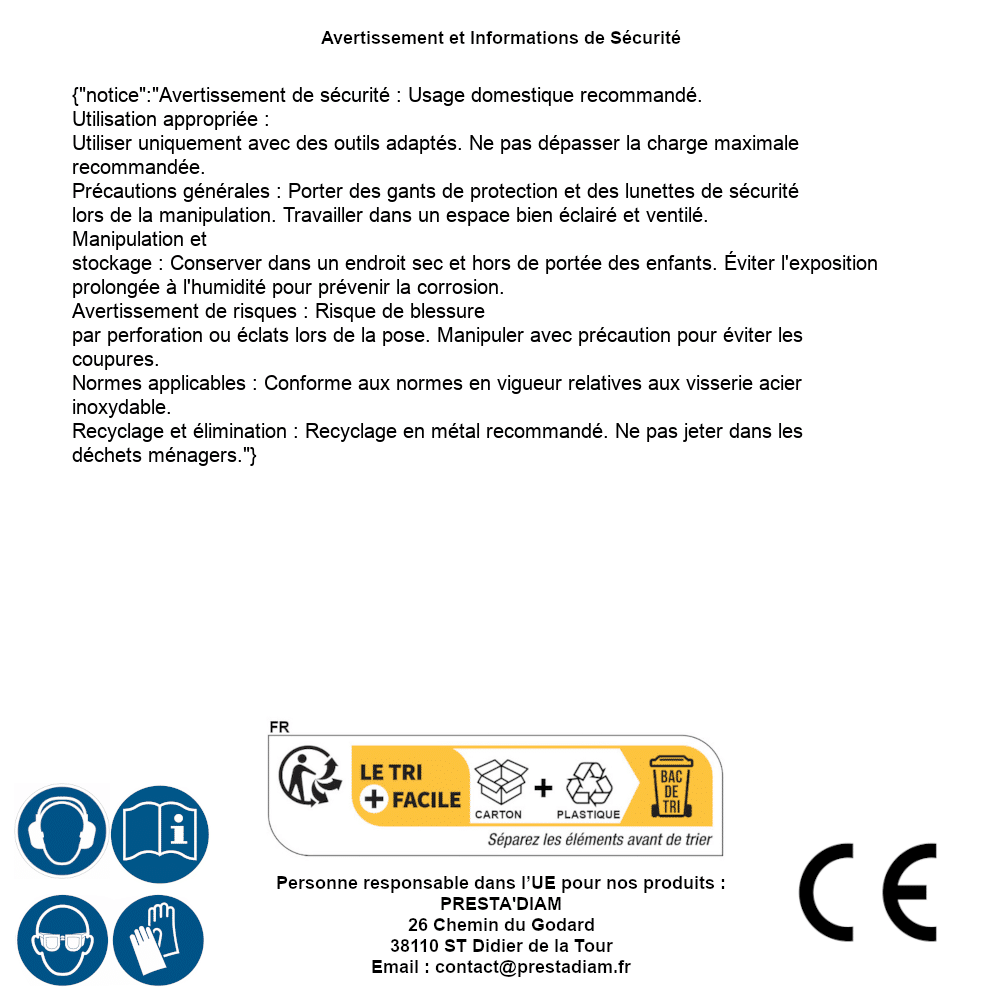 | AVERTISSEMENT et SECURITE | Identification de la personne responsable dans l’UE : Nom : PRESTA'DIAM. Adresse : 26 Chemin du Godard, 38110 ST Didier de la Tour (France). Email : contact@prestadiam.fr. |