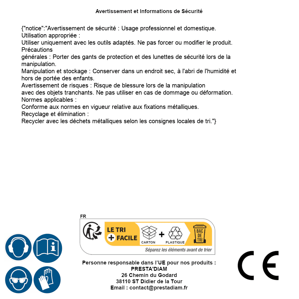 | AVERTISSEMENT et SECURITE | Identification de la personne responsable dans l’UE : Nom : PRESTA'DIAM. Adresse : 26 Chemin du Godard, 38110 ST Didier de la Tour (France). Email : contact@prestadiam.fr. |